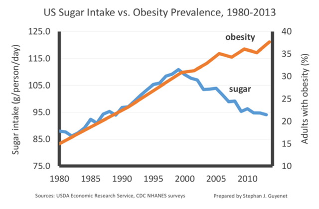 Since the USDA records began on sugar and obesity intake (1980), a positive correlation between the two was seen. But, just before the new millennia, this relationship just stopped. Between the years 1980 and 1998, both increased by about 15%, but after, obesity kept climbing, and sugar consumption tanked, leaving us with a negative correlation.