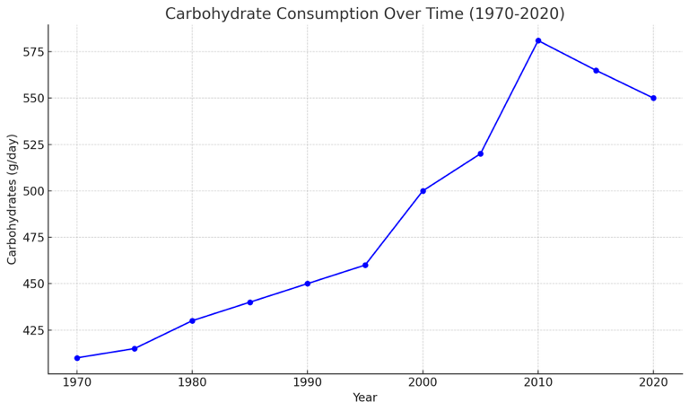 But, why is all of this so important? Well, when we take a glance at this graph below showing the daily carbohydrates eaten in grams per day, we might be able to understand one of the reasons Dementia diagnosis has skyrocketed.