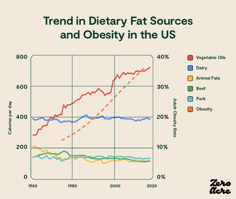 As the prevalence of obesity and heart disease surged, one of the significant shifts during the 1970s was the major adoption of seed oils into everyday foods. Currently labelled as “heart-healthy” by the American Heart Association (AHA), processed food and fast-food companies discovered the ability to use cheap and abundant industrial by-products in their food. McDonald’s and Burger King switched from beef tallow to vegetable oil, KFC moved to soybean oil, and Nestlé, Kraft Heinz, PepsiCo, and General Mills all transitioned to similar cost-effective oils.