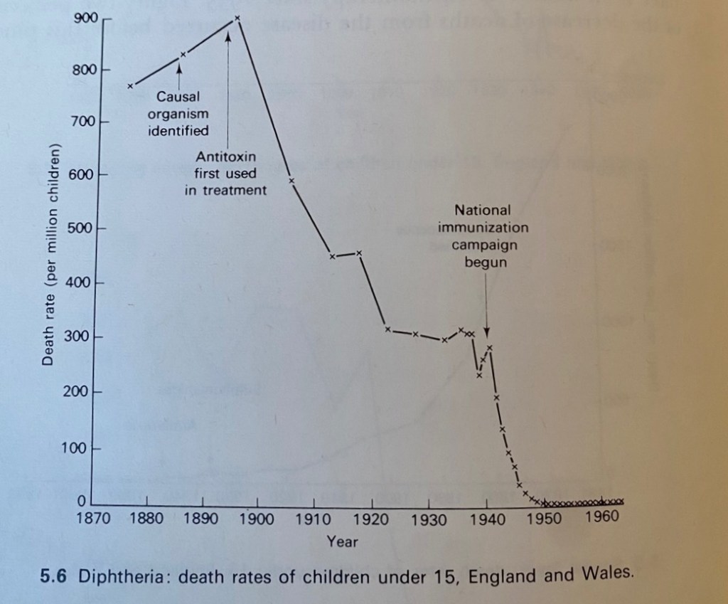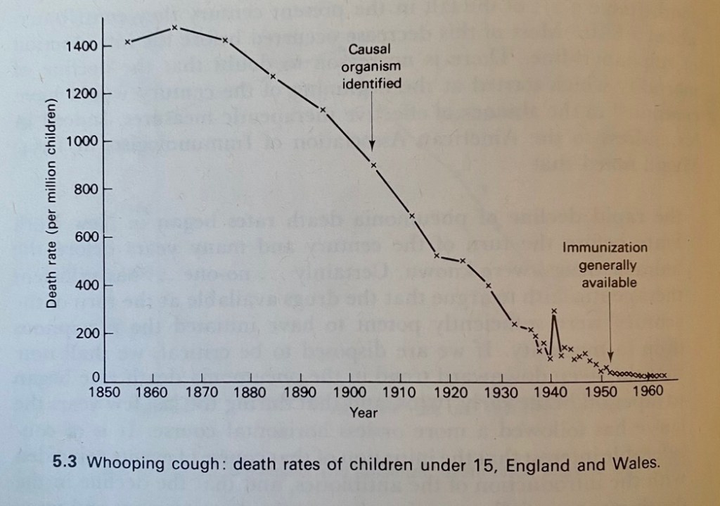 Firstly, let’s start with whopping cough. Characterised through cold like symptoms that progress into apnea and difficulty breathing, this life-threatening illness infect those under 6 months old due to their immature immune system and small airways. Rightfully, it has been one of the biggest worries for new mothers since the early 1900s, with death rate hitting 850 per million officially diagnosed infections. As a result, in 1952, the immunisation for whooping cough become readily available to the public, helping millions of infected infants across the western world. Although, this immunisation is effective, and relatively safe, by the time it was introduced, the death rate had dropped by 94%, standing at 50 per million. Interestingly, this significant reduction was attributed to advances in personal hygiene, the cost-effective antibiotics, herd immunity, and diagnostic tools.