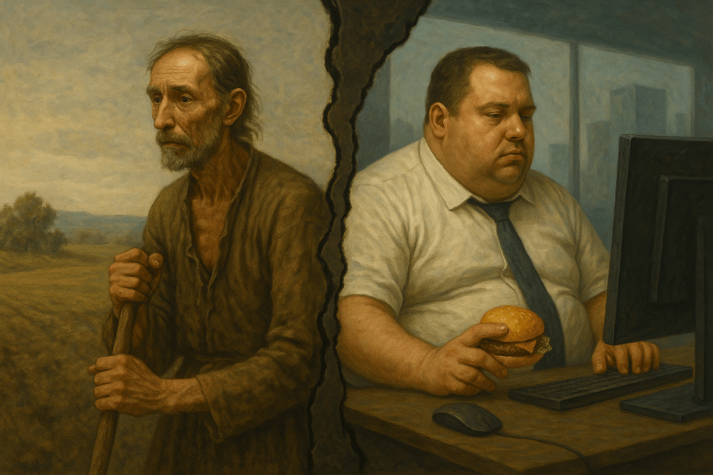 However, work and safety have improved in some ways. Dangerous manual labour, child labour, and workplace accidents were far more common in the past. Today, regulatory standards and technology protect most workers. War, famine, and violence were routine threats for most ancestors but modern societies, especially in high-income countries, are generally safer and more stable. Yet, the pressure to maintain constant connectivity, job insecurity, and the erosion of work-life boundaries have introduced a whole new form of stress. This so-called “disease of civilisation” affects not only the body, but also the mind and spirit.